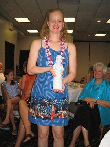 Erica holds up a gift from her grandmother. | Dinner with the groom's family